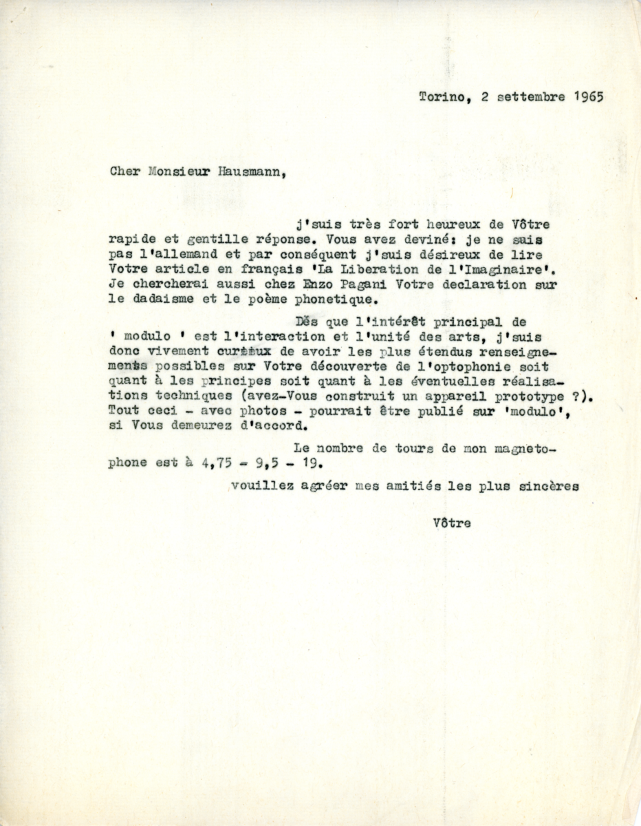 - Typewritten letter from Arrigo Lora Totino to Raoul Hausmann, Turin, 1965Courtesy Fondazione Morra