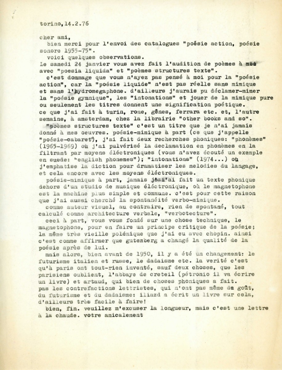 - Typewritten letter from Arrigo Lora Totino to Bernard Heidsieck, Turin, 1976Courtesy Fondazione Morra