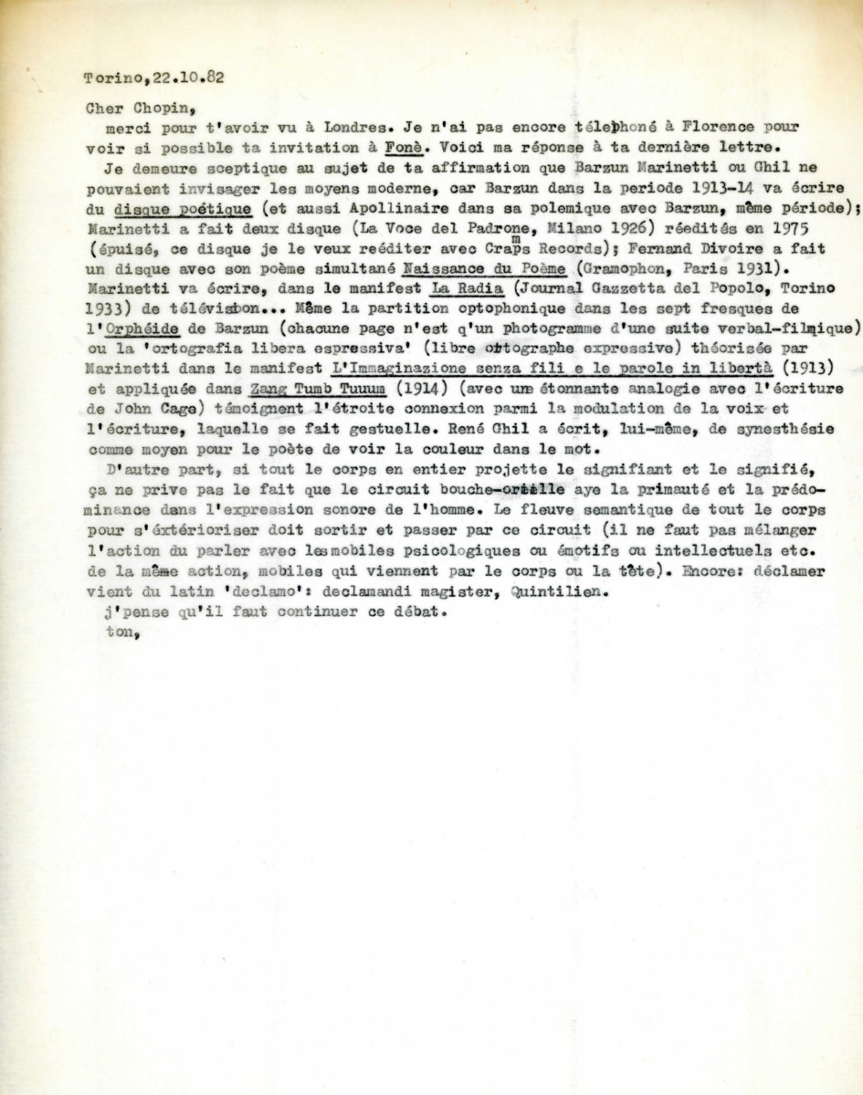 - Typewritten letter from Arrigo Lora Totino to Henri Chopin, Turin, 1962 Courtesy Fondazione Morra