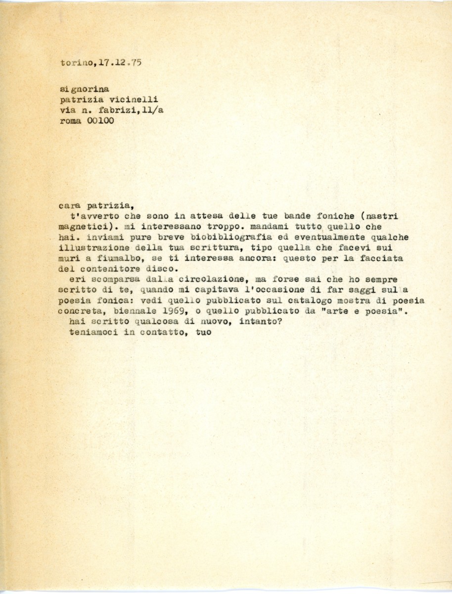 This subsection houses the correspondence Totino received from individual artists over the years documenting the various interests shared by the artist and his correspondents. The authors represented mostly belong to the world of the European and international neo-avant-garde: Raoul Haussman, François Dufrêne, Henri Chopin, Bernard Heidsieck, Francesco Cangiullo, Pierre Garnier, Max Bense, Heinz Gappmayr, Carlfriedrich Claus, Jean François Bory, Franz Mon, Carlo Belloli, Dick Higgins, Stelio Maria Martini, Luciano Caruso, Jiří Kolář, Adriano Spatola, Eugenio Miccini, Ugo Carrega, Giovanni Fontana, Sarenco and many others. There are also some of Arrigo Lora Totino’s letters in reply to some received from his interlocutors.
