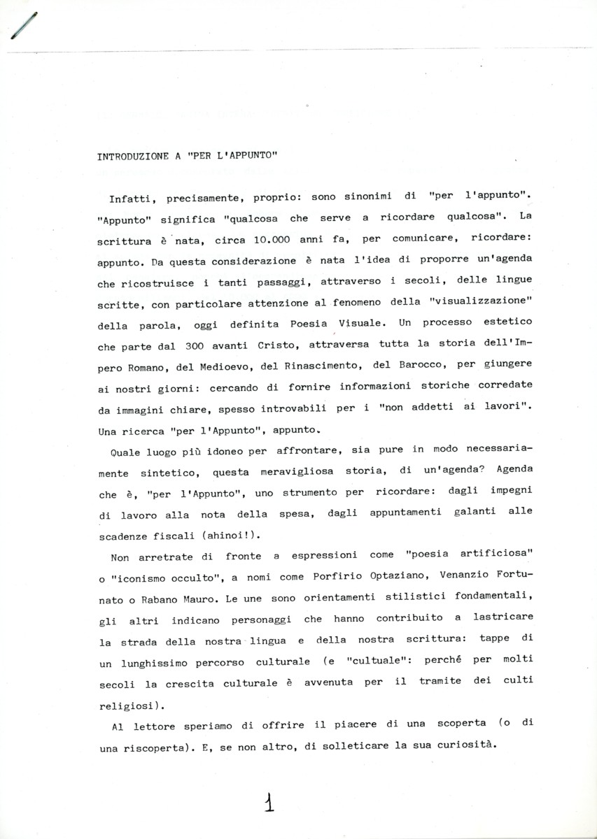 The section contains the artist’s copious manuscript output together with the study materials necessary for the composition of his theoretical essays, linear and extra-verbal poems, contributions, and critical articles for publication in magazines, periodicals, and catalogues; the section also contains the professional documentation of many artists with whom Totino corresponded. The section does not include ALT’s printed writings, which are contained in the ALT library section.