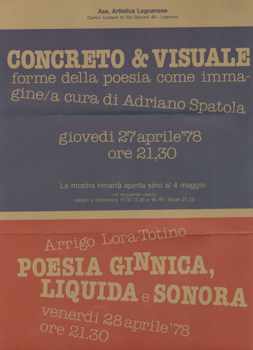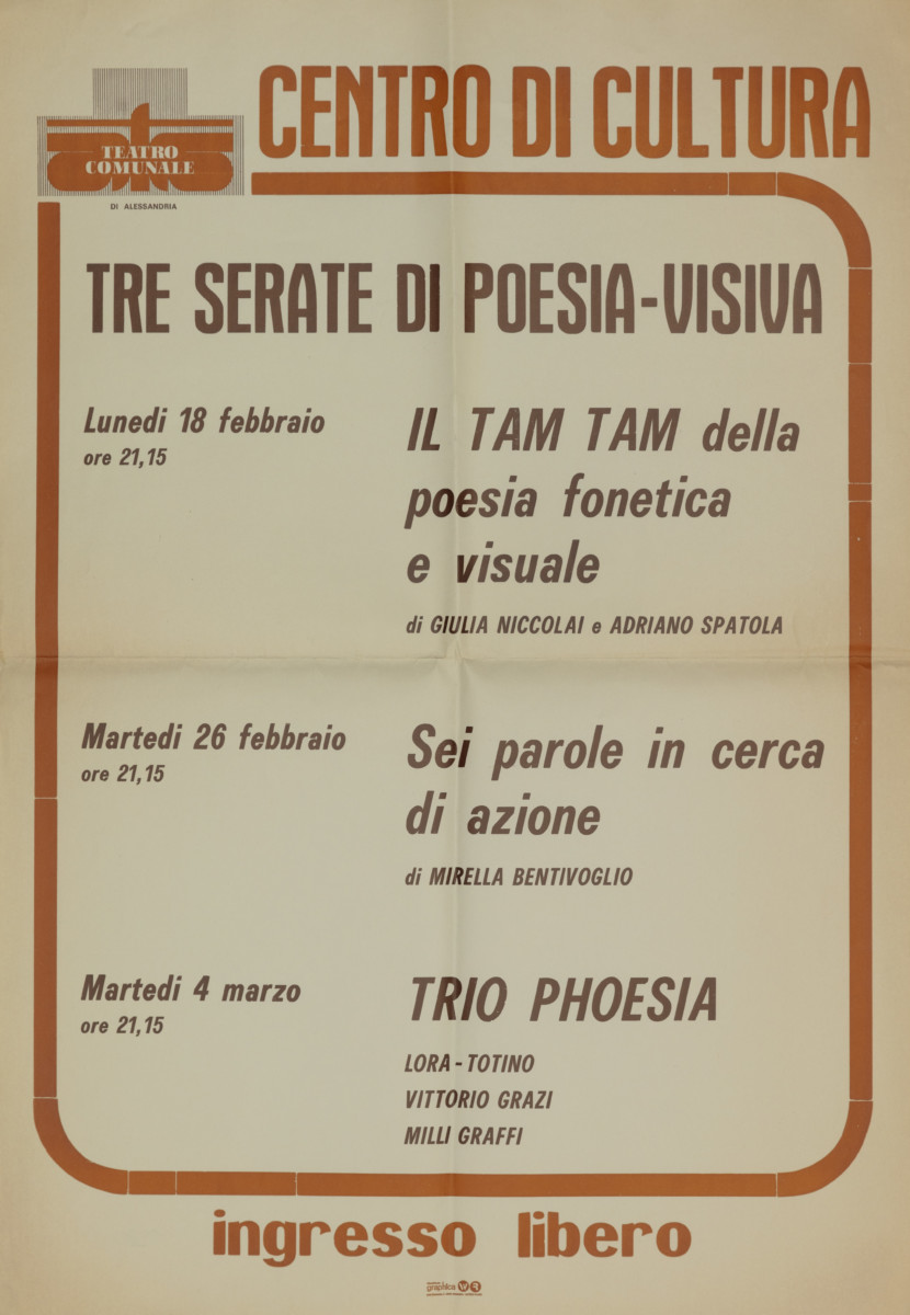 Arrigo Lora Totino (Turin, 1928-2016) is one of the greatest interpreters and exegetes of international concrete and sound poetry. He is a very well-known and respected performer and has produced numerous publications and recordings connected to the work of neo-avant-garde artists around the world, participating in and organizing festivals, study sessions, events, and sound poetry evenings.