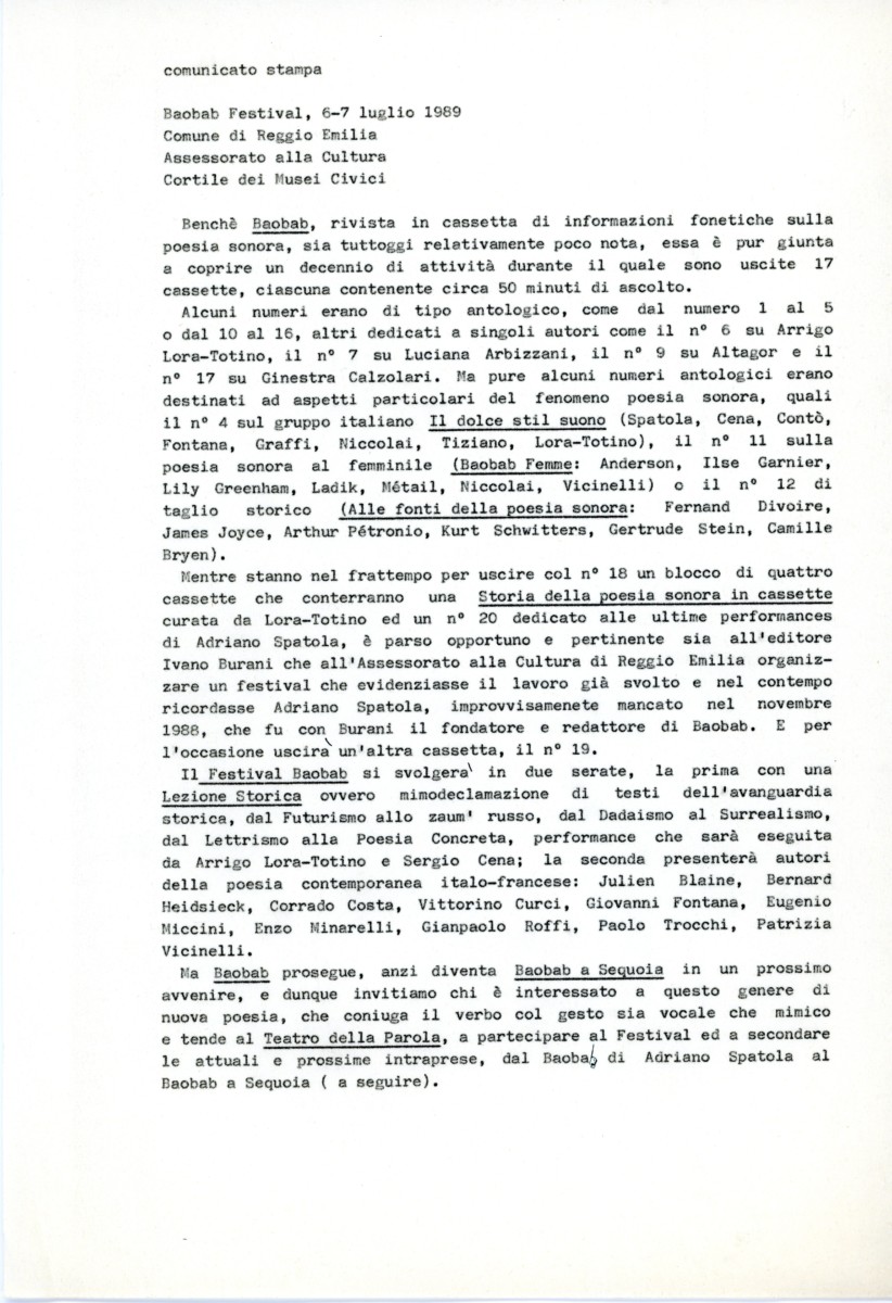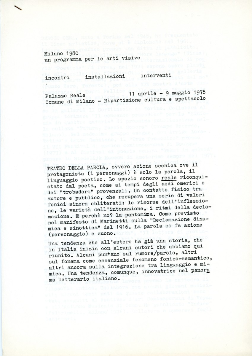This subsection is dedicated to the preparatory work for the homonymous 1978 box set containing 8 records and an associated printed volume edited by Totino for Cramps Records in Milan. To date, this is one of the most complete publications ever dedicated to world sound poetry. The archive contains letters and documents between Totino and the authors featured in the box set, including Henri Chopin, Bernard Heidsieck, Gerard Rühm, Paul De Vree, Bob Cobbing, Altagor, Carlfriedrich Claus, Ladislav Novák, Adriano Spatola, Patrizia Vicinelli, Maurizio Nannucci.