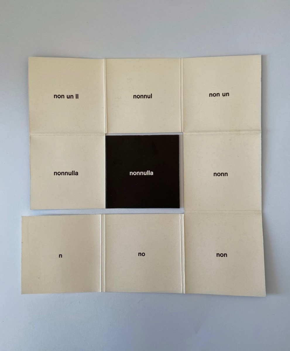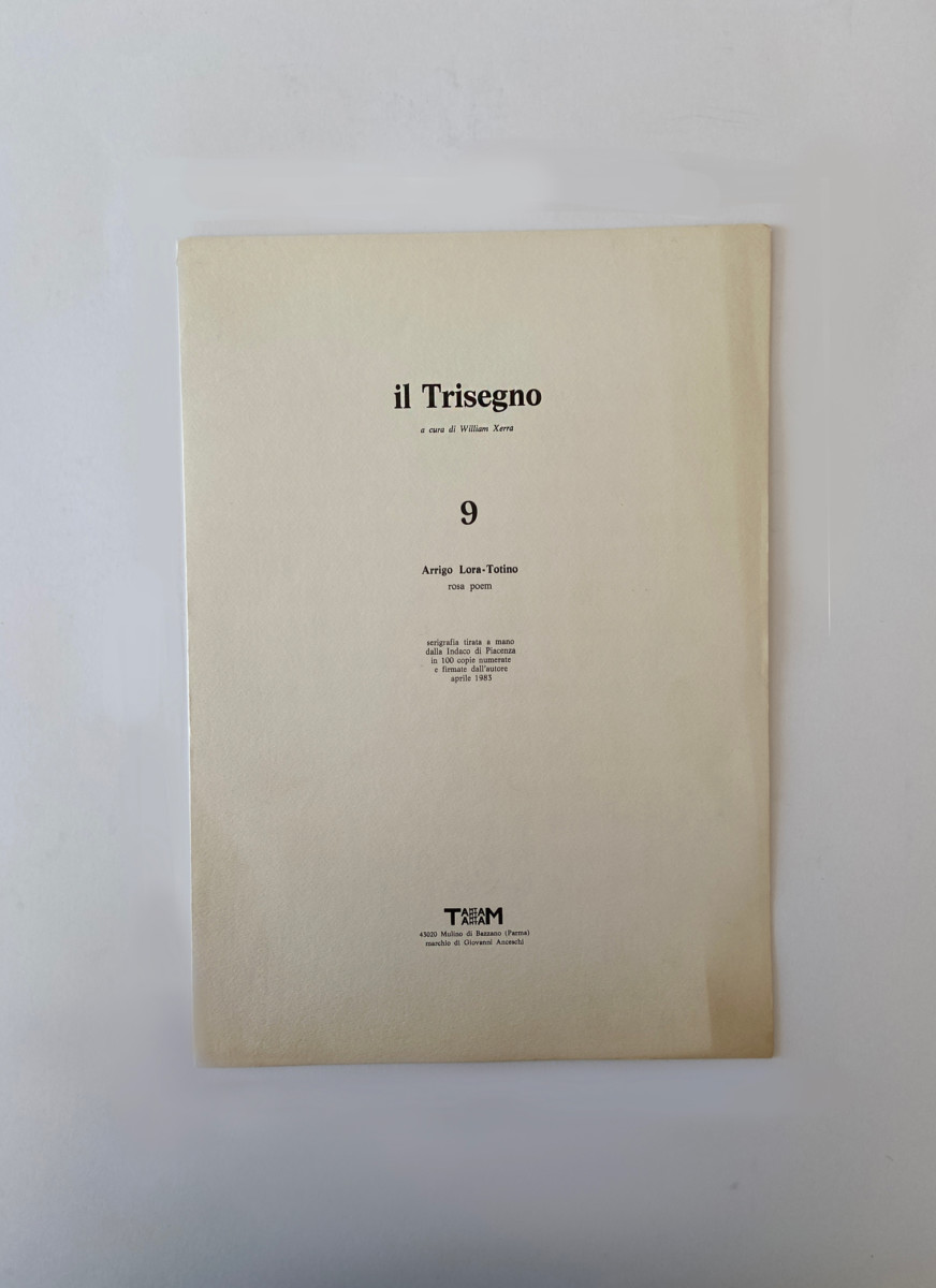 The collaboration and partnership between Arrigo Lora Totino and the Morra Foundation began in the late 1980s when the Turin-based author took part in the “Temperature Flegree” event organized by Studio Morra at the Solfatara in Pozzuoli and the Cuma Acropolis, an event attended by poets and scholars such as Henri Chopin, Lamberto Pignotti, Eugenio Miccini, and Corrado Costa. Here, Lora Totino presented his performance “Fluenti traslati”, for which he published the performance directions in 1988 in a volume of the same title curated by edizioni Morra. A year later, in 1989, Totino repeated the performance of “Fluenti traslati” for his personal exhibition of verbal-visual works held at Studio Morra in via Calabritto.