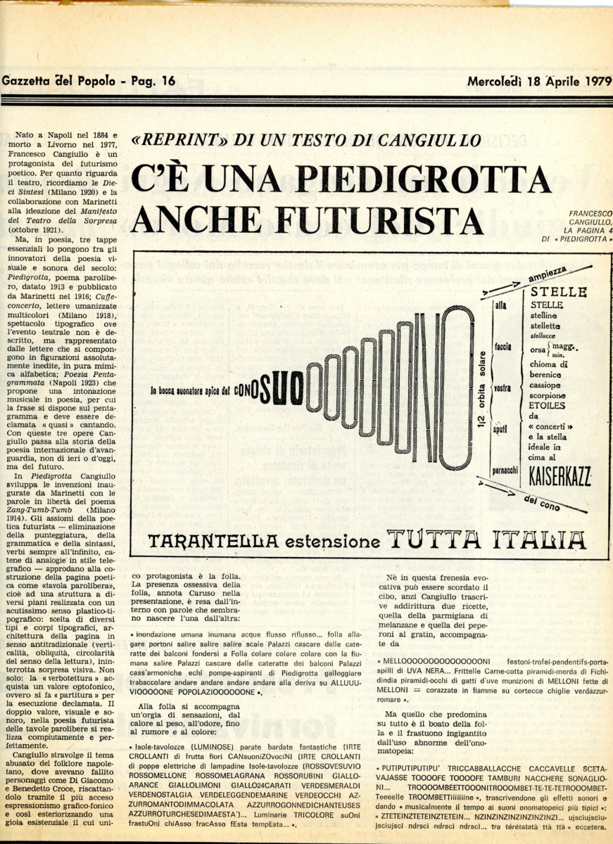 After this first intense collaboration, Totino took part in a new project organized by Studio Morra curated by Luciano Caruso, “Serate in onore di Cangiullo”, an event dedicated to the Neapolitan Futurist poet Francesco Cangiullo. Totino took part in a round table discussion with Stelio Maria Martini (8 May) and Luciano Caruso, marking the release of the volume “Cangulliana” (Belforte/edizioni Morra, edited by Caruso himself). He also presented a mime declamation performance (9 May) dedicated to the Futurist free-word and pentagrammed tables.