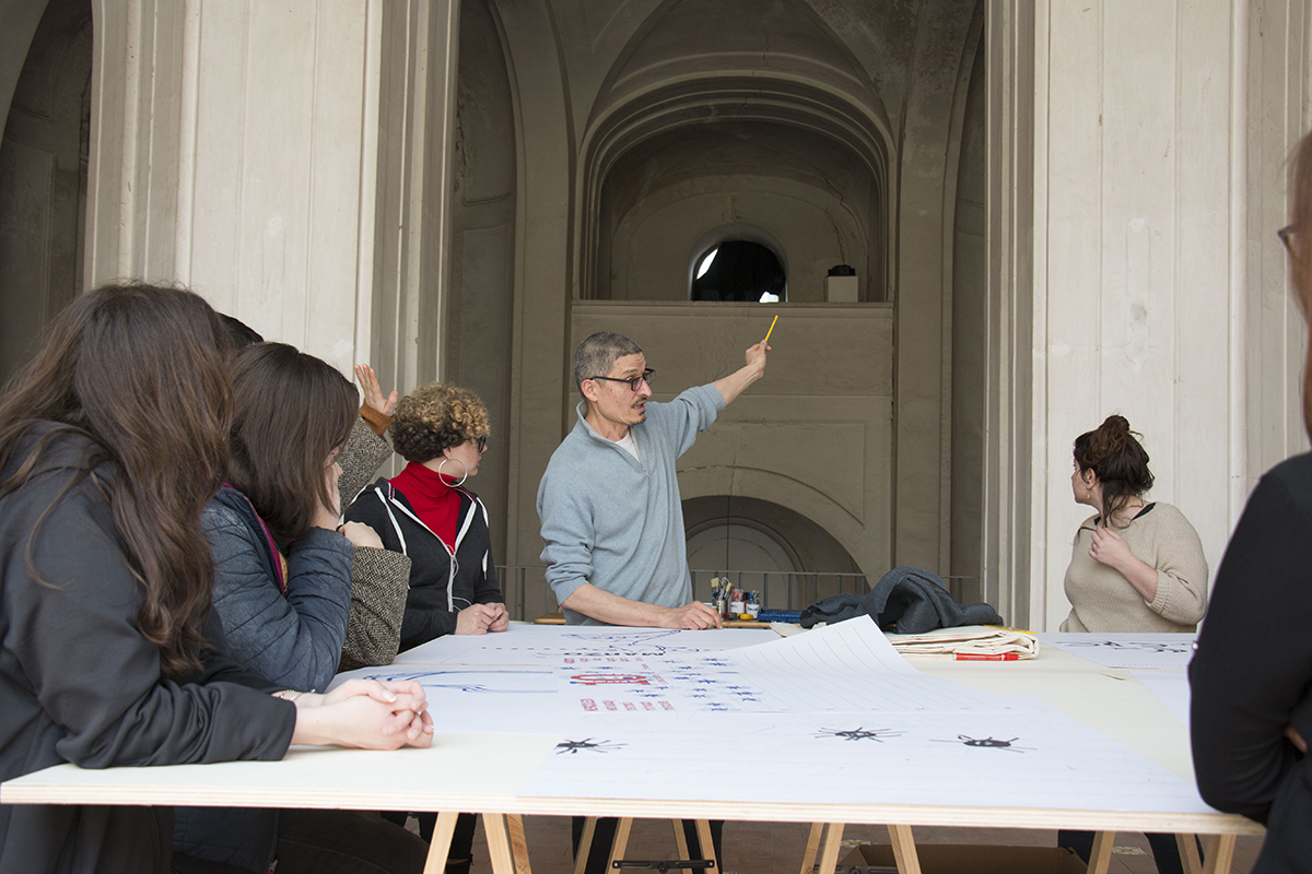 The students will also be able to design and realize one or more series of large quantities of drawings made with heterodox techniques and materials (fire, beer, salt water, etc.), according to methods already used by the artist for “free productions and distributions” of drawings since 2005.