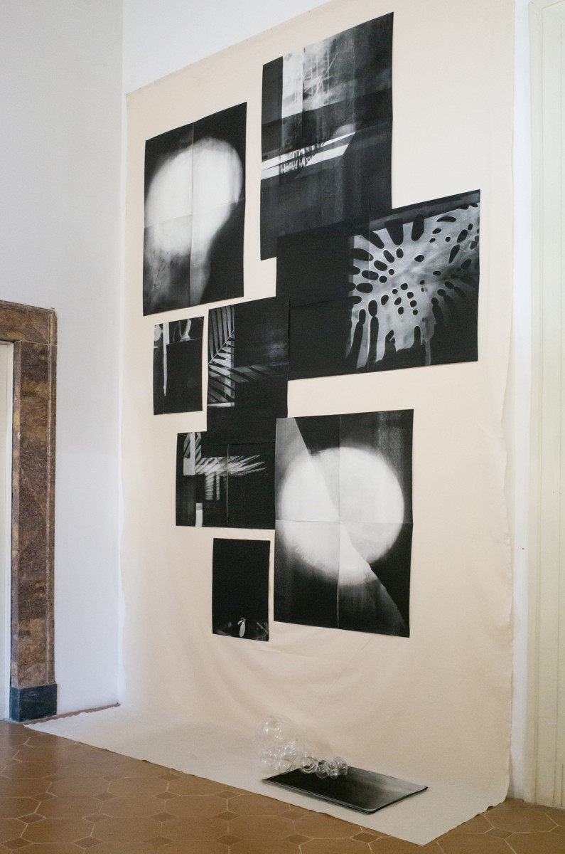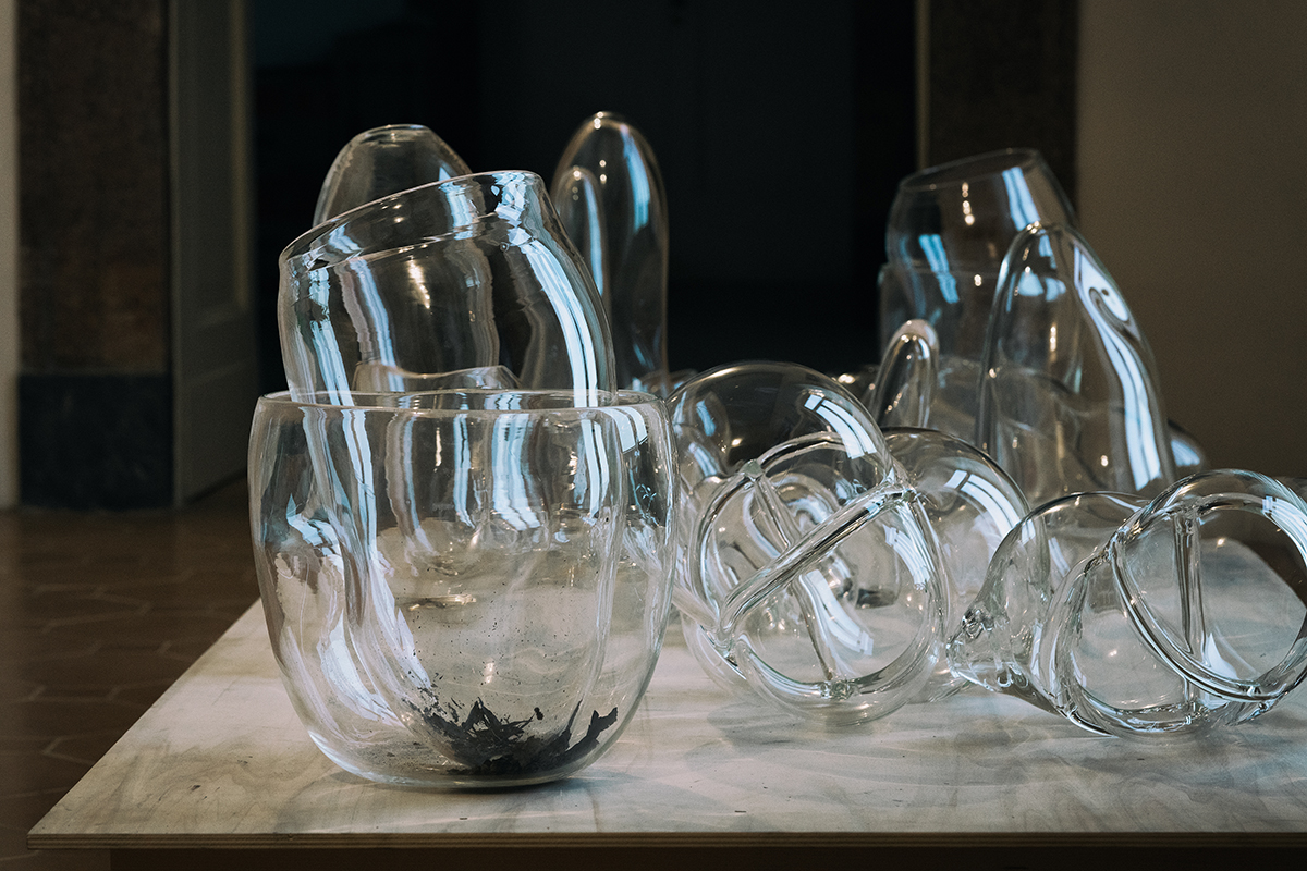 In the historical spaces of Palazzo Tarsia, glass sculptures and serigraphs are presented as the two main areas of density of the installation, determining the core around which the presentation of further assembled elements, organized in an immersive landscape, revolves.