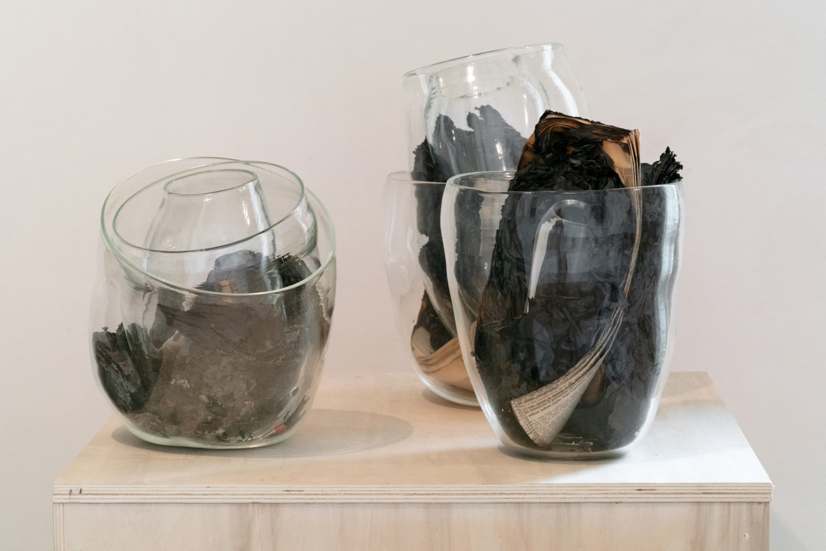 Living and recovered materials such as paper, glass, burned newspapers and pigments contribute to the creation of works that allow the viewer to immerse in a landscape organised as a self-sufficient ecosystem that, by suggesting new forms, creates new contents. Where every element becomes part of a whole.
