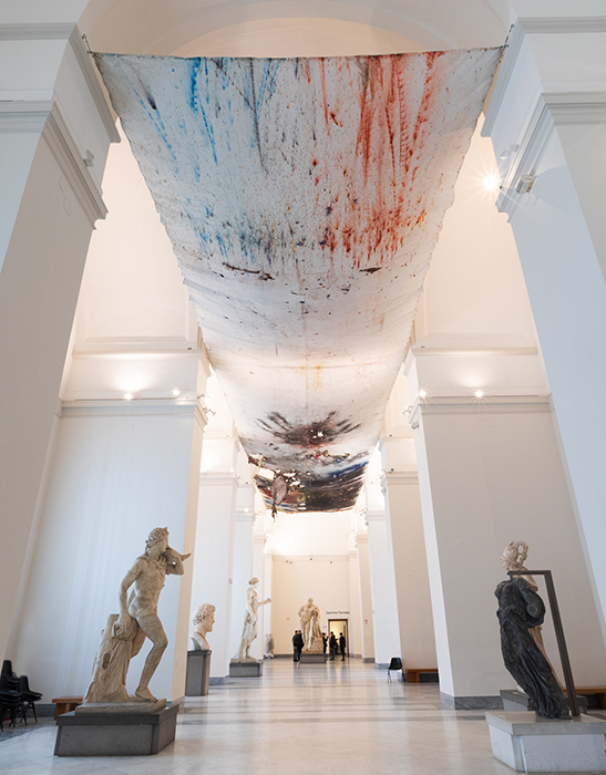After the Explosion Studio in the Amphitheatre, the “In the Volcano” journey will come to its natural conclusion with the exhibition at the MANN: the long canvas used for the performance in Pompeii will be on display in the Museum lobby, stretching out among the arches and vaults like a protective veil to welcome the public until March 11th.