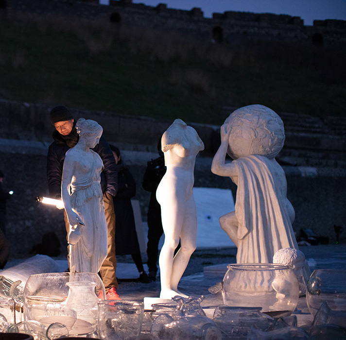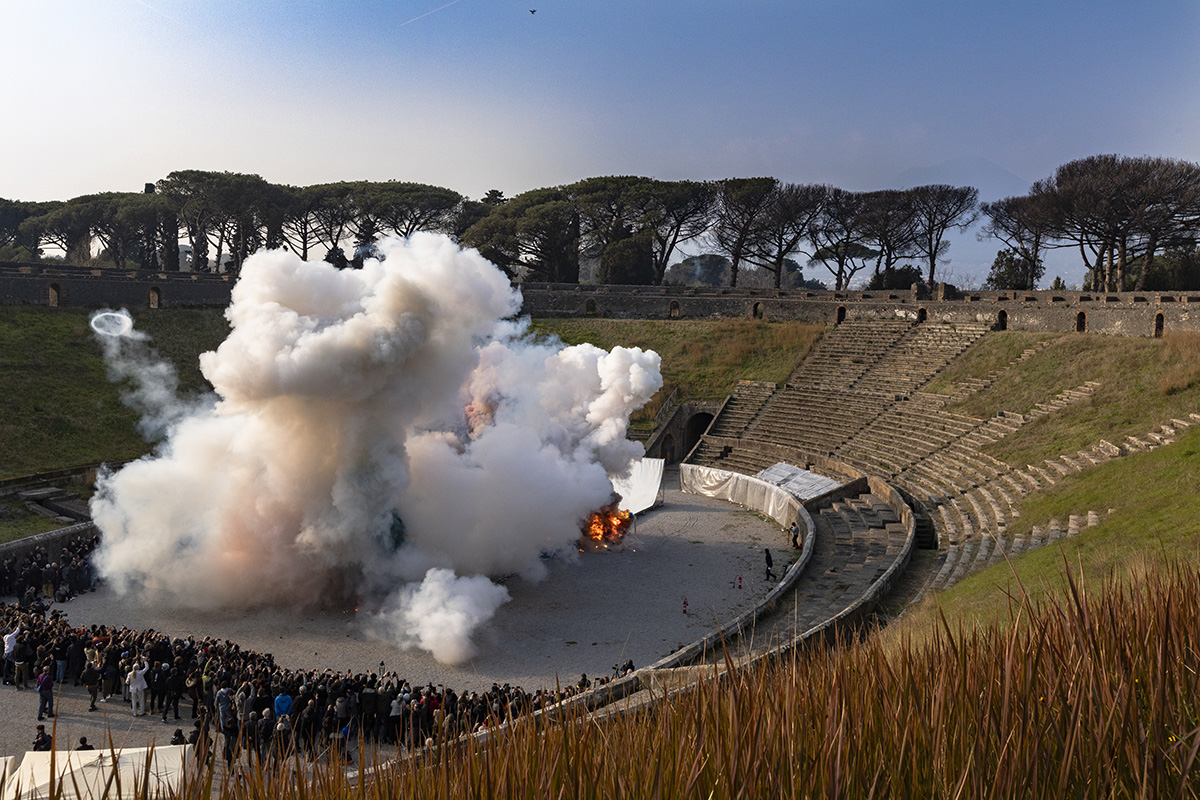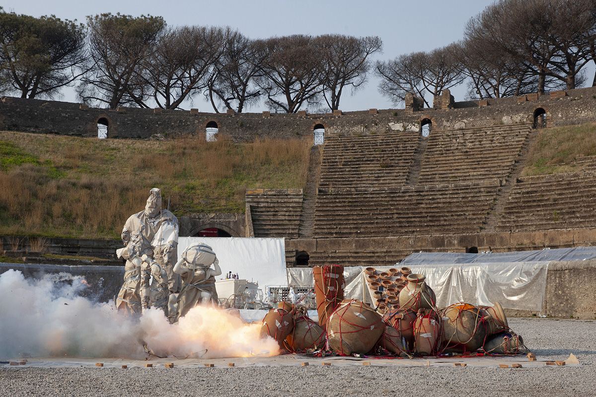 The Pompeii exhibition with the evocative title “Canvas of Civilization” is in three parts – small explosions will disrupt the artefacts arranged on the canvas, marking it violently and inexorably, with the same ruthlessness that has left its mark on human lives; after a brief pause, there follows “Sigh”, using coloured fireworks lined up along the canvas and pointing towards the sky as though in an unrelenting volcanic eruption, fireworks that will recall the sound of a heavy sigh, that of the rise and fall of human civilization. After another short break, peace will reign once more. Then “Excavation” will begin – amid the last fumes; the artist and his team will bring to light the “archaeological ruins”.