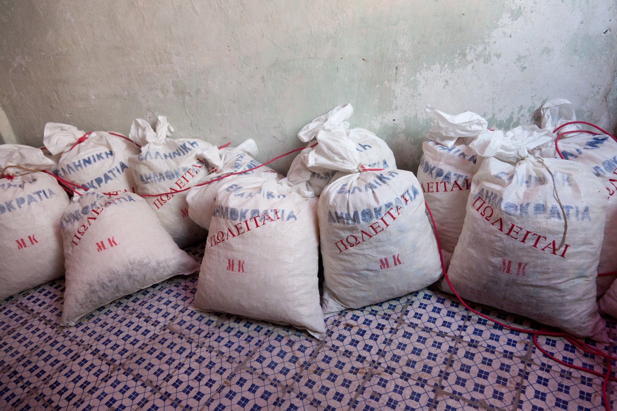 al primo, nell’abitazione di Vincenzo Bergamene sono sistemati lavori in ceramica e pietra lavica, mentre nell’appartamento del secondo piano è ospitata la documentazione fotografica di Salvatore Giusto. Sul balcone del terzo piano campeggia una tabella di 10 metri rivolta al golfo e alla città, con la scritta ΠΩΛΕΙΤΑΙ su fondo bianco e all’interno dello stesso livello è allestita l’edicola votiva Santa Maria del ΧΥΝΩ: di Mary Zygouri. Al quarto piano, l’artista presenta Aderfikos, un poema disegnato in 90 fogli accompagnato dal testo di Achim Gnann. Al quinto piano è visitabile l’atelier di Matteo Fraterno e la relativa terrazza dove è esposta l’opera di Martin Kaltner. Dal piano terra, al centro del palazzo, lungo tutta l’altezza di questo, un’istallazione sonora di Zafos Xagoraris, ci conduce fra i rumori e le voci dei venditori ambulanti della Grecia contemporanea.