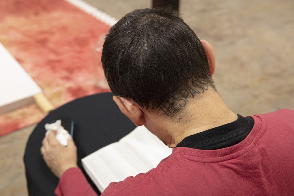 Fade Into is a durational performance series responding to permanent collections and exhibitions in museums and galleries. Artist selects an artwork and through durational performance builds a live installation around its specific political and artistic relevance. During five hours of this performance a whole range of readings of the chosen artwork and their connotations become a canvas on which the performer projects his voice and body. The building elements of this intervention are charged with textual references questioning the specific artwork’s medium, context, content and history and its different particularities. By reading these textual references aloud to the museum visitors, artist fills the space with intangible perspectives as well as corporeal aspects which are attached to the selected work of art and its context. Physical contours and boundaries between corporeal and intangible are gradually blurred as the performer’s body fades into a color that dominates the space. This happens through slow, meticulous and repetitive movements with which the artists paints his whole body over a period of a couple of hours before the movements subside and we are left with the sculptural stillness of the performer. Embodiment of all hinted and expressed meanings emerges as a live installationthat offers a paradigm shift to museum visitors in relation to a particular space and work in the musem.