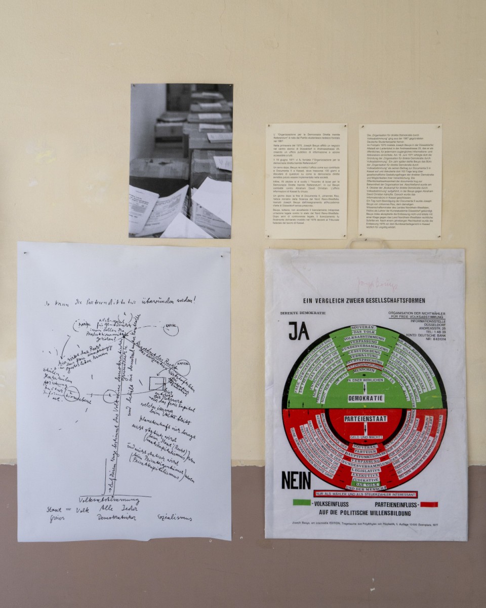 In mostra anche una selezione di multipli, funzionali alla strategia divulgativa del più ampio progetto beuysiano di “scultura sociale”: per l’artista tedesco il problema del “dare forma” non ha a che vedere con una ricerca stilistica interna allo spazio di autonomia dell’arte, ma si risolve nelle possibilità antropologiche di formare/organizzare tutti i campi del sociale a partire dalla creatività individuale. Si tratta, a ben vedere, di quello che Achille Bonito Oliva, nel corso della prima fondamentale intervista a Beuys nel 1971, definisce come uno “spazio socratico”. L’intuizione critica è confermata dallo stesso artista: “l’arte mi interessa solo in quanto mi dà la possibilità di un dialogo con l’uomo”. E le possibilità costituenti dell’arte, in un senso inclusivo e democratico, sono esemplarmente indagate da Beuys nel suo storico contributo a Documenta 5 (1972) dove per cento giorni allestì l’ufficio per l’“Organizzazione per la democrazia diretta tramite referendum”. Di questa esperienza a Kassel viene presentata un’inedita documentazione fotografica di Vettor Pisani.