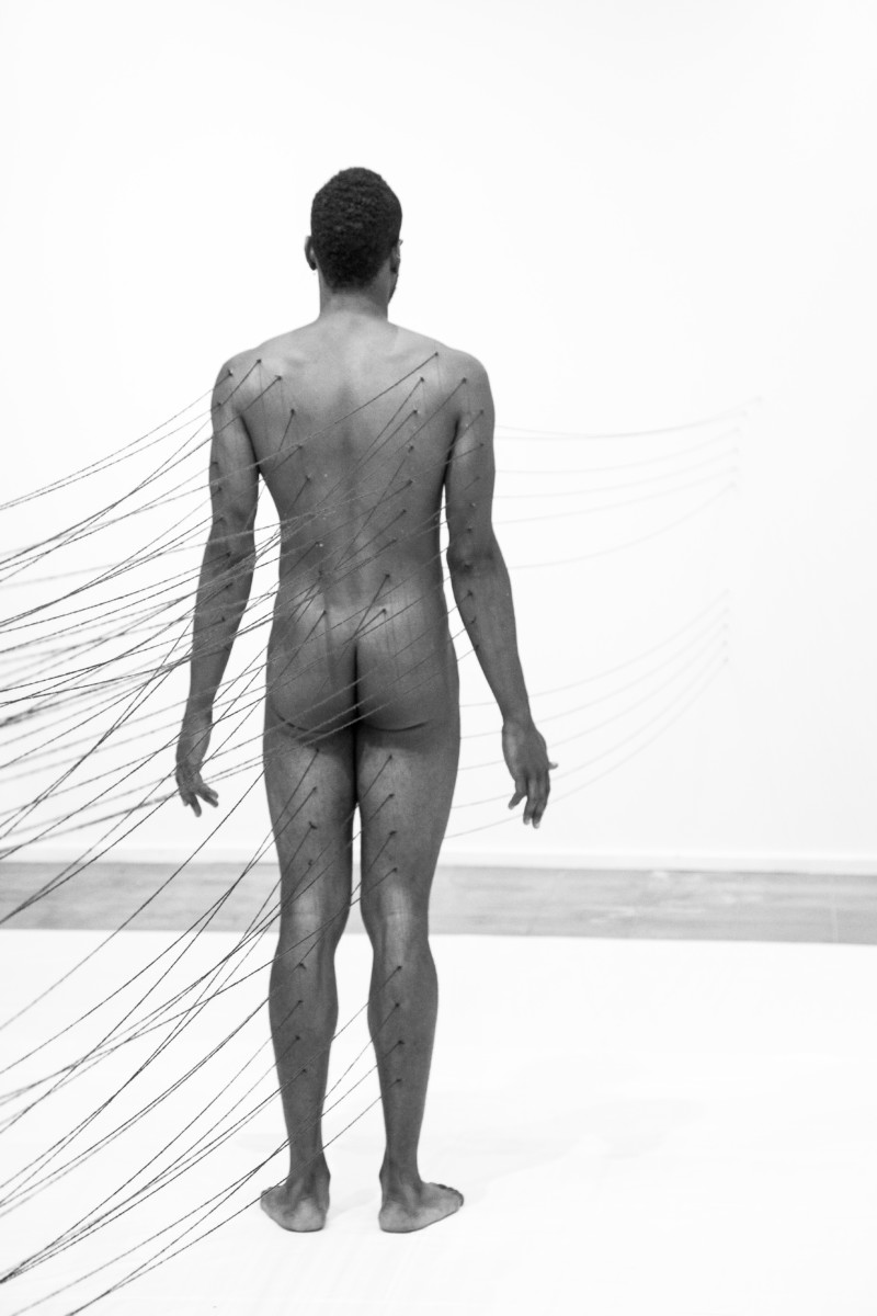 Il corpo dell’artista diviene un paesaggio da attraversare e percorrere, la sua pelle una tela da personalizzare e penetrare, le sue appendici rami da cui pendono precisi segni di appartenenza: il luogo dell’incontro fra codici differenti e molteplici. L’azione diviene uno sforzo di congiunzione tradotto in tensione geometrico-performativa, sofferenza ed estasi quasi mantrica di un corpo declinato nella sua irriducibile alterità.