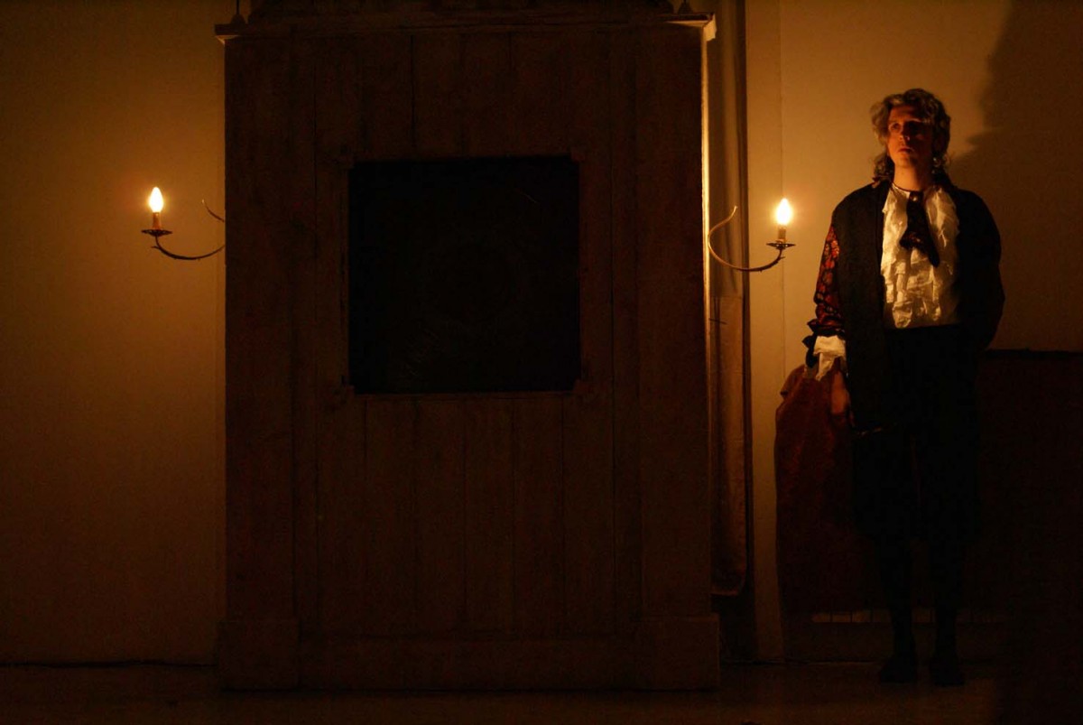 – Il salotto è articolato in IV stanze ricreative che vengono abitate e vissute da quattro attori nel rituale d’impersonificazione tragico dell’Andromaca. I convenuti (il pubblico?) prendono posto fra gli spazi delle IV stanze, come parte integrante di questo salotto stilizzato. Il salotto è fisicamente ideato per grandi sale o giardini di palazzi sei-settecenteschi, “ruderi museali” in cui la storia è lungamente sedimentata.