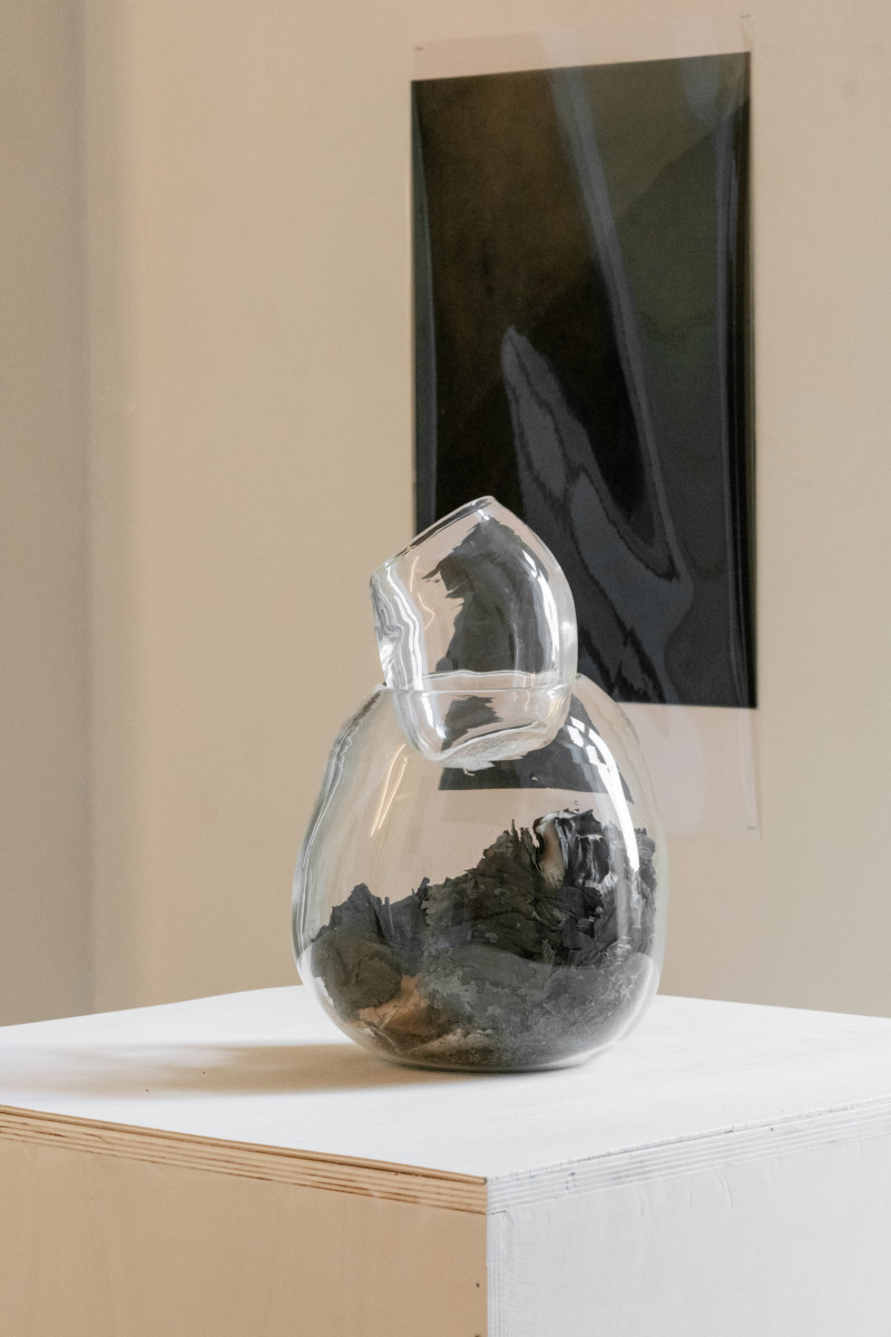 La mostra si presenta come un punto di incontro tra il lavoro di stampa, scultoreo e pittorico. Materiali poveri e vivi come la carta, vetro e giornali, concorrono alla realizzazione di opere che permettono di immergersi in un panorama costituito da lavori organizzati in un ecosistema autosufficiente che, suggerendo nuove forme, crea nuovi contenuti. Dove ogni elemento diviene parte di un tutto. I soggetti delle stampe su carta ed elementi come negativi e collage rimandano ai significati e al valore che originariamente avevano, ma sono ora arricchiti di una semantica addizionale, mentre, nel contempo, i volumi in vetro riflettono la complessità del gesto creativo. La materia viene modellata e poi tradotta nell’uso di diversi media, gli elementi si trasformano e, infine, i significanti agiscono sul contenuto. Nulla può essere isolato, tutto muta come durante l’eruzione del magma vulcanico.