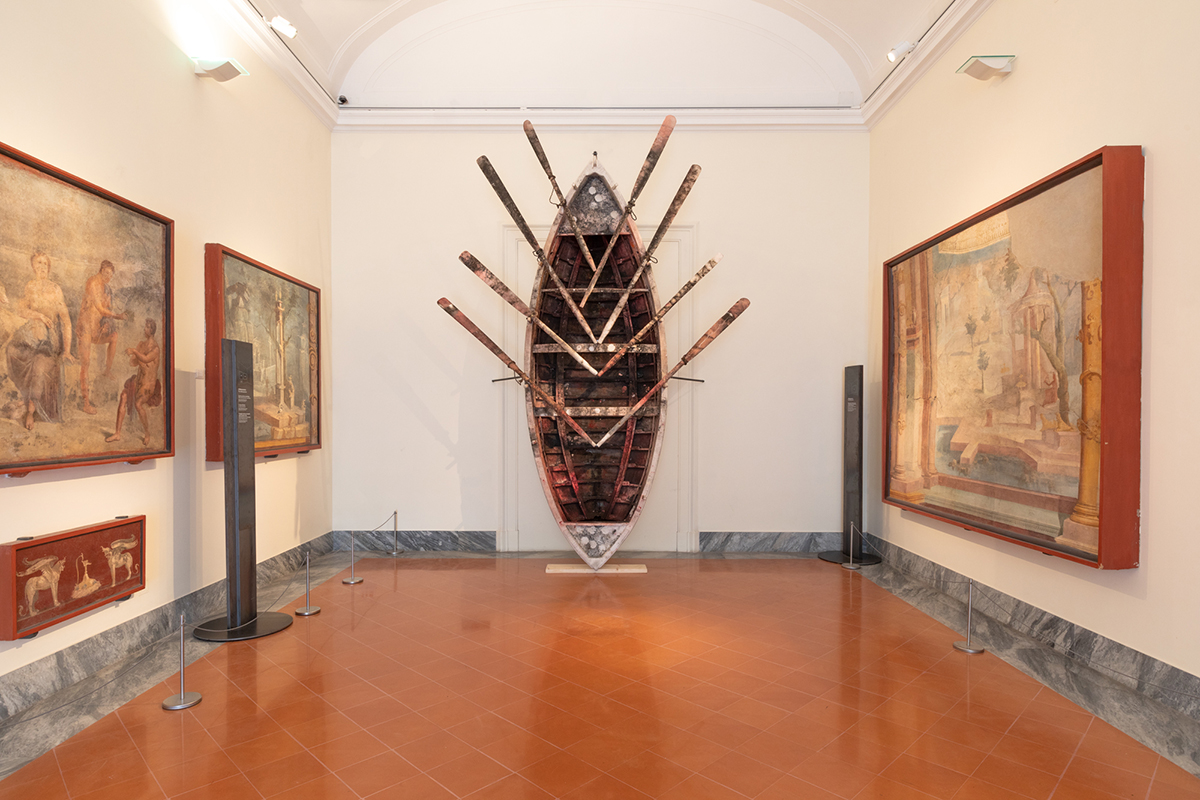 Se semplici piattaforme andranno a racchiudere vasi ed oggetti di terracotta, rimandando alla quotidianità dei romani, sarà la riproduzione di una barca, fissata alla parete e posta accanto agli affreschi pompeiani, a svelare il segreto atemporale di un viaggio artistico sempre in fieri.