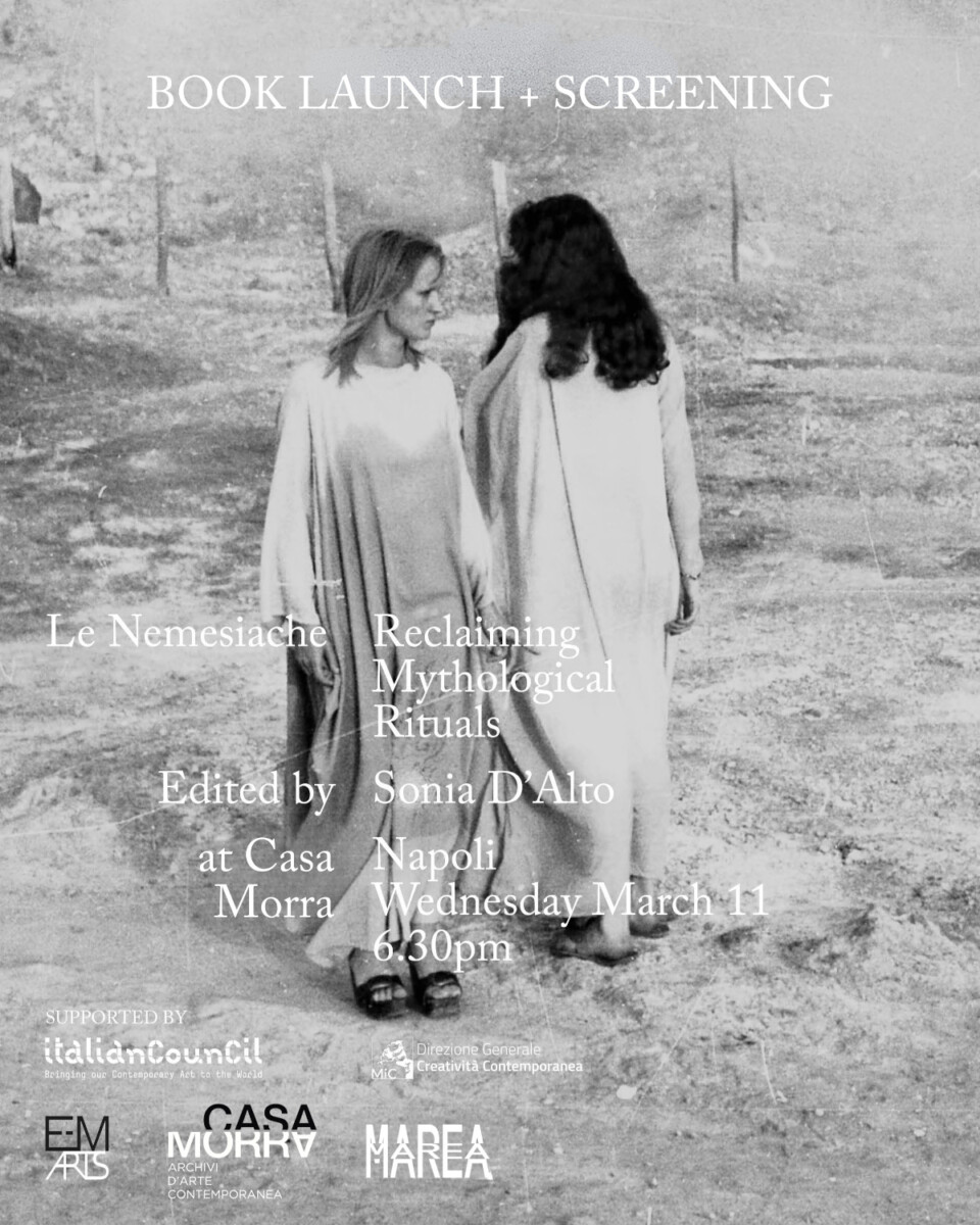 Presso gli Archivi Mario Franco / Casa Morra fa tappa il tour della prima monografia internazionale su Le Nemesiache a cura di Sonia D’Alto in collaborazione con Marea Art Project, progetto vincitore di Italian Council 13 ed. (2024) promosso dal MIC Direzione Generale Creatività Contemporanea, edita da Mousse Publishing. Frutto della ricerca di Sonia D’Alto attraverso la frequentazione del gruppo e lo studio dell’Archivio delle Nemesiache (ex associazione Le Tre Ghinee) e dell’Archivio privato Lina Mangiacapre (Posillipo), il volume raccoglie preziosi documenti, fotografie e manifesti inediti sull’eccezionale natura processuale e collettiva del loro lavoro.