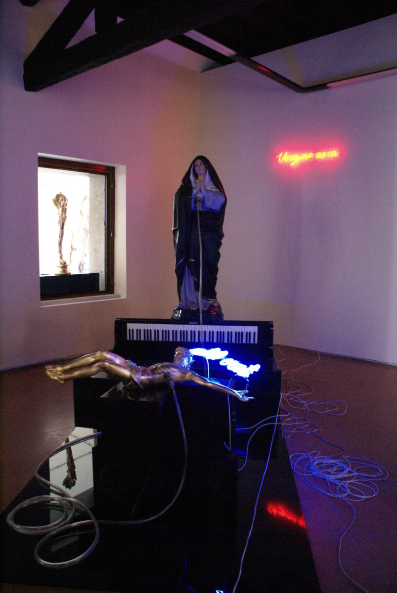 Negli spazi dell’isola di San Servolo, che ha ospitato per oltre due secoli un ospedale psichiatrico, Vettor Pisani espone una serie di opere tra le quali La Venere di cioccolato del 1970, la scultura Hermes del 1975 e L’Addolorata del 2007, una madonna posta su un pianoforte verticale rovesciato, incentrata sui temi del lutto e della malinconia. L’opera è la maschera, la soglia che l’artista non può varcare, perché il mondo lo riconosce in maniera definitiva e niente può sottrarlo a tale riconoscimento: nessuno slittamento nel silenzio può ridurlo a produttore di eventi quotidiani.