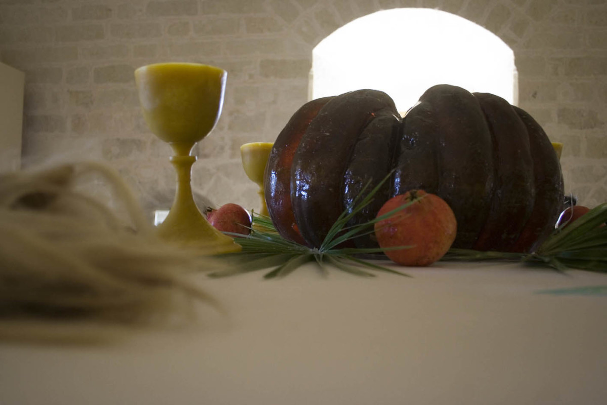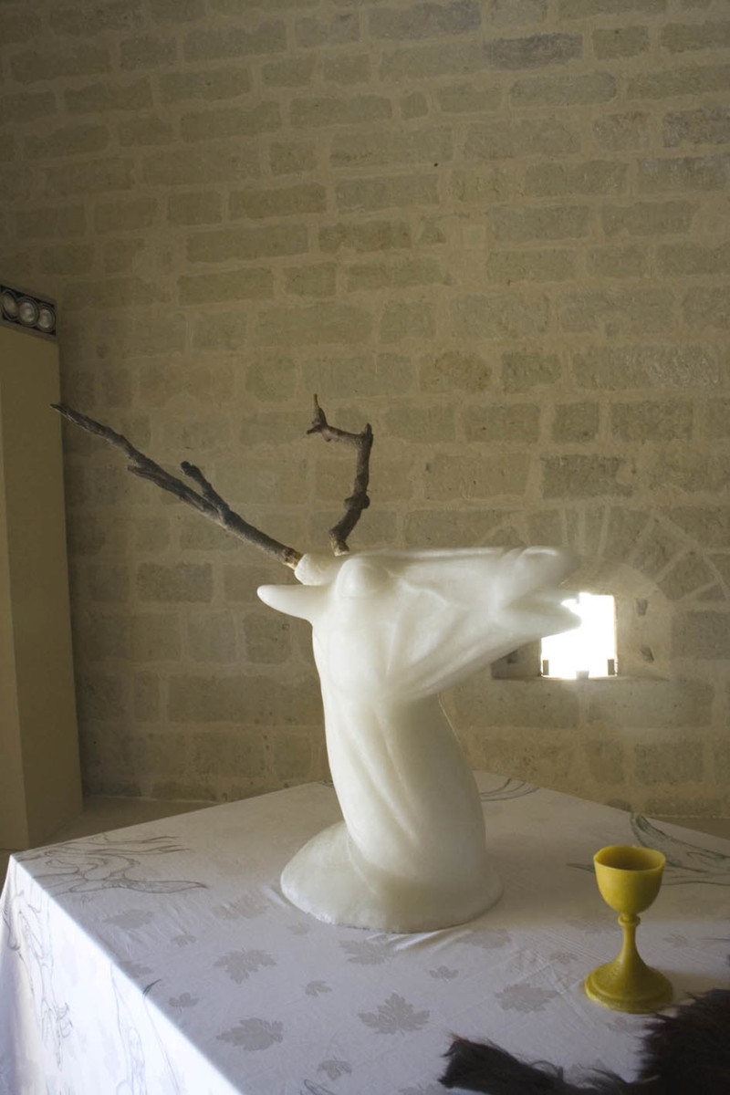 L’opera è la sua stessa mensa, paragonabile a quella di un re, pur tuttavia una tavola che sembra imbandita con le sue stesse carni: le due teste di cervo in cera bianca dai riflessi alabastrini appaiono come parte di un trofeo di caccia, ma anche come commensali, come nobili fruitori di una cena allegorica tra pelli di capra selvatica, coppe realizzate in cera d’api dal profumo di miele e una zucca magica ed apotropaica in ambra di pino.