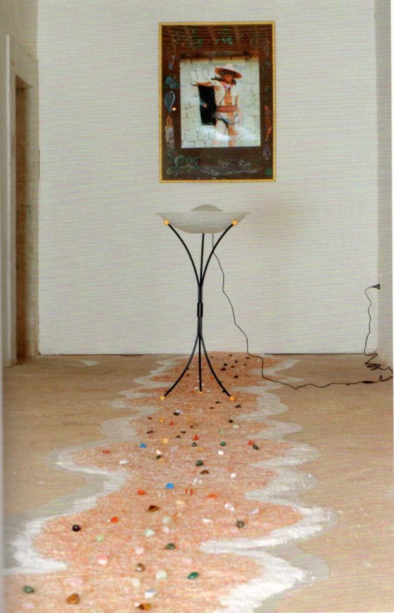 Si tratta di un’opera complessa, in cui si sovrappongono in sorprendente sequenza oggetti, immagini, reliquie legate all’immaginario culto di Lily Moore, fantomatico artista vissuto in un lontanissimo futuro. Ad essere trasfigurato da incongrue e allusive presenze (sale himalayano, gemme, cristalli iridescenti, decori su carta thailandese) il corridoio della cella, dove si svolge – ricostruito da Virgilio Pervinca, immaginario archeologo del tempo futuro – un percorso iniziatico al termine del quale si staglia luminosa l’icona del sacerdote artista.