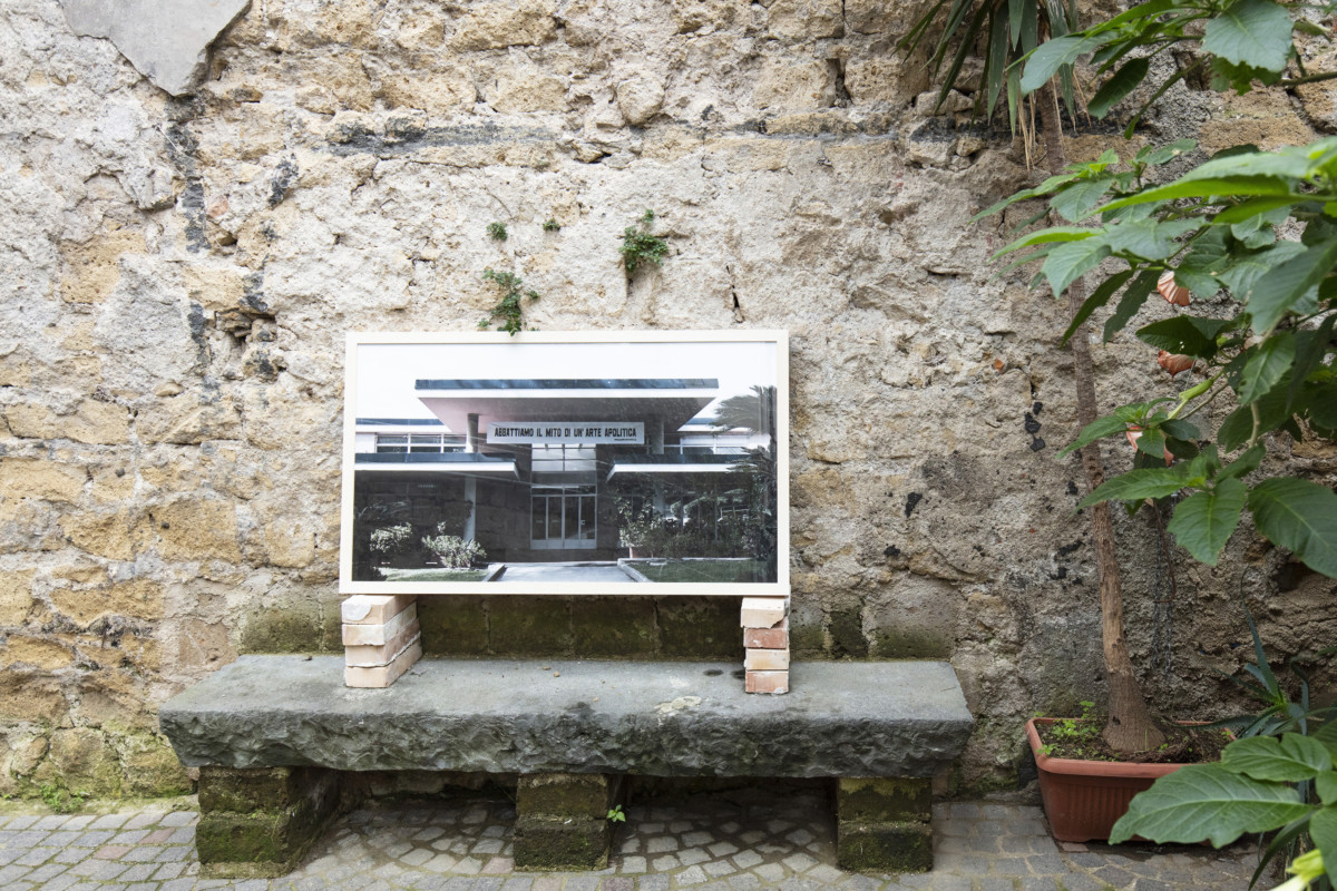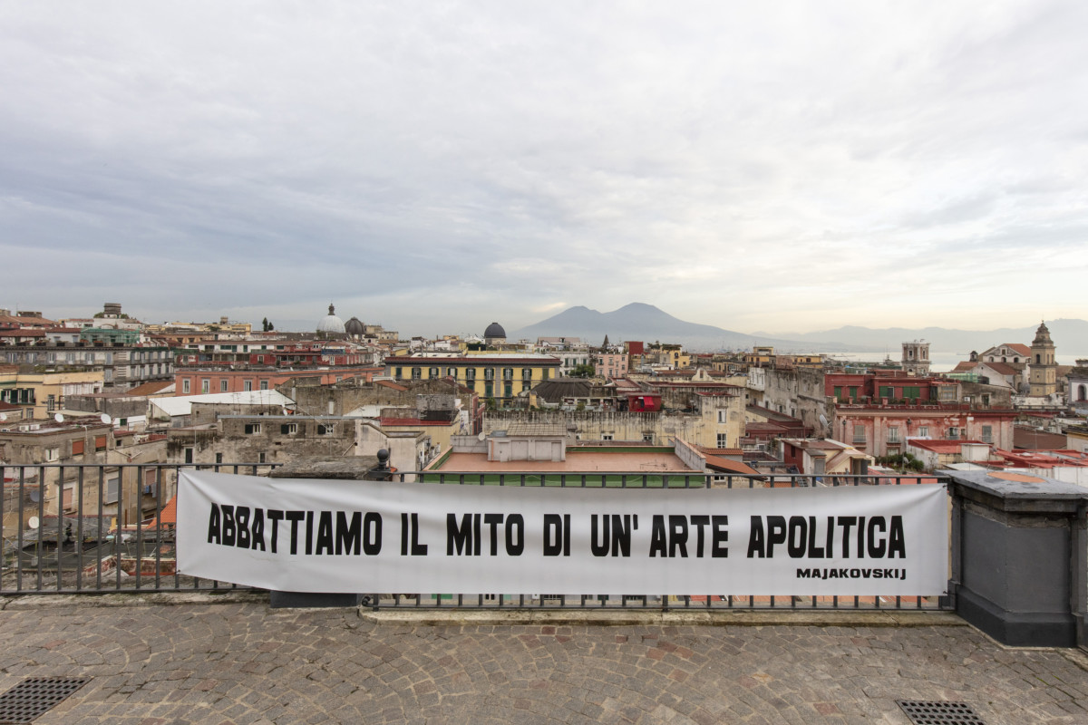 Qualsiasi sia il medium scelto o la modalità di intervento fino ad includere lo stile personale di vita, Igor Grubic applica coerentemente una visione politica al suo modo di vivere e quindi di fare arte. Smash the Myth è in qualche modo una tautologia con cui Grubic dichiara, parafrasando l’ideologia radicale del poeta russo della rivoluzione Vladimir Mayakovsky, che l’arte NON POLITICA non esiste perché qualunque espressione artistica, o anche il solo pensiero, non può che essere un gesto politico e riflettere la responsabilità che l’artista ha nei confronti della società. La sola scelta di esporsi ad un pubblico – e di scegliere a quale pubblico esporsi compreso quello del mero mercato dell’arte – è un atto politico. La serie Smash the Myth consiste in microinterventi negli spazi urbani in cui Grubic appone, in maniera temporanea e talvolta illegale, un banner in luoghi iconici di varie città. Iniziata a metà anni ’90 con il progetto Micro-Museum of Revolutionary Heritage la serie ha toccato diverse città come Berlino, presso il Soviet War Memorial di Treptower Park e Dresda di fronte all’Accademia di Belle Arti, e approda ora a Napoli nella mitica fabbrica Olivetti. Fondata nel 1955 su progetto dell’architetto razionalista Luigi Cosenza, la ex Fabbrica Olivetti è simbolo della visione umanistica di un industriale illuminato la cui missione imprenditoriale era direttamente collegata al benessere dei suoi lavoratori. Con un’impostazione socialista ante litteram per l’Italia, Adriano Olivetti, a Pozzuoli come nelle altre sedi italiane delle sue fabbriche, aveva voluto per i suoi dipendenti un luogo in simbiosi con la natura e dotato di tutti i servizi necessari convinto che il lavoro fosse strumento di riscatto sociale. All’interno di questo piccolo eden dei lavoratori, Grubic ha scelto di apporre il suo “motto” su quella che un tempo era stata la biblioteca, luogo per antonomasia per l’arricchimento dello spirito.