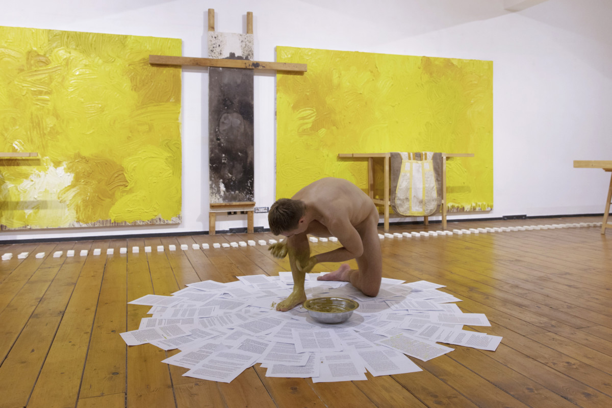 Elementi costitutivi della performance sono riferimenti testuali che esaminano nello specifico il medium dell’opera, il suo contesto, il contenuto, lo sfondo storico e le sue particolarità. Leggendo queste tracce e offrendole al pubblico, l’artista riempie lo spazio con prospettive intangibili e aspetti corporei, in stretta relazione con l’opera selezionata ed il suo immediato contesto. I contorni fisici e i confini tra il corporeo e l’intangibile diventano gradualmente sfocati mentre il corpo del performer si fonde in un colore che, infine, domina lo spazio. Questo avviene attraverso lenti, minuziosi movimenti ripetitivi con i quali l’artista dipinge il suo intero corpo fino al dissolversi degli stessi movimenti, lasciando lo spettatore davanti all’immobilità scultorea del performer. L’incarnazione di tutti i significati accennati ed espressi emerge come un’installazione dal vivo che offre un cambio di paradigma ai visitatori in relazione a uno spazio e un’opera d’arte particolari in un museo.