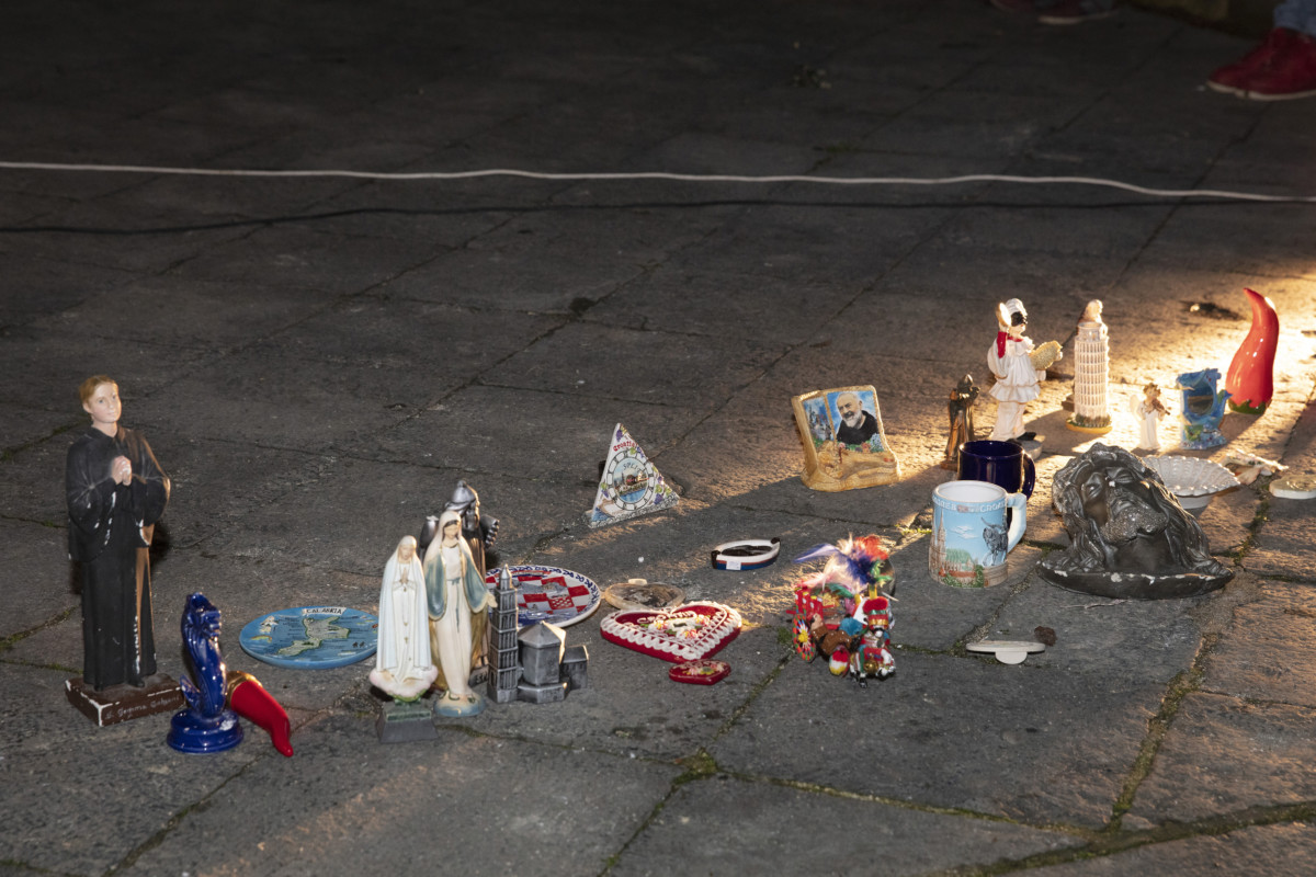Iniziato a Belgrado nel 2012 e proseguito a Parigi nello stesso anno, il progetto Visiting Reality si basa sull’idea che l’identità nazionale coincida con il MITO su cui si costruisce il mondo contemporaneo a tal punto che i popoli iniziano a credere che quest’identità, sia l’essenza del loro essere. Siamo tutti consapevoli del fatto che la storia è più complessa e che il fatto che ci identifichiamo con un certo popolo solo in base ai meri i confini geografici sia un semplice eufemismo. Con la sua carriera da artista, Sterle ambiva ad espandere la sua coscienza sulla complessità del sé e del mondo contemporaneo ed invece constata nel presente solo il senso di decadimento che permea l’ambiente sociale e politico in cui vive. La performance mette a confronto la mitologia nazionale di due paesi utilizzando come dispositivo artistico i kitsch souvenir turistici che in fin dei conti si rivelano piuttosto simili qualitativamente ed esteticamente. Fracassandoli al cospetto del pubblico e ridotti in polvere, formano una sorta di realtà astratta. Si è finalmente così in grado di iniziare a “leggere” oltre il “materiale” mentre ci si avvicina alla complessità di cui sono fatte le nostre vite. L’artista usa l’atto della distruzione come metodo di creazione mettendo sotto esame due forze opposte.